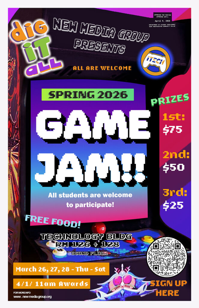 ITECH student club New Media Group is launching their 1st annual DIG IT ALL GAME JAM event. All students are welcomed to participate. The event will take place for 3 days Thursday-Saturday, March 26-28 – 9am-9pm (in-person and remote is acceptable) Food will be served. TEC Bldg. Rm 208.